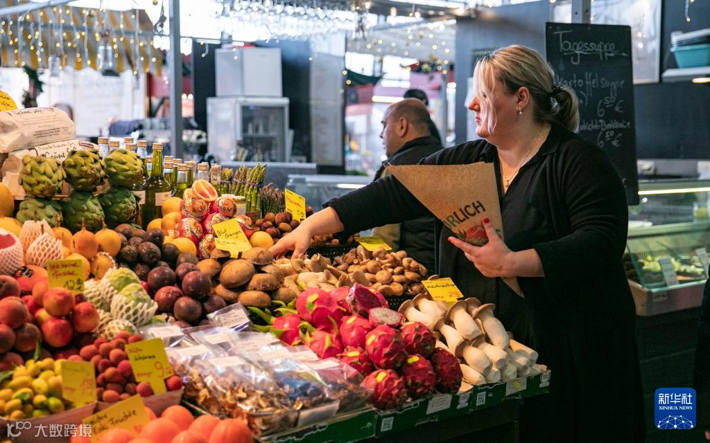 12月20日,在德国法兰克福“小市场大厅”,一名摊主为顾客挑选水果。“小市场大厅”始建于19世纪末,是法兰克福市中心著名的农副产品零售大厅。新华社记者 张帆 摄