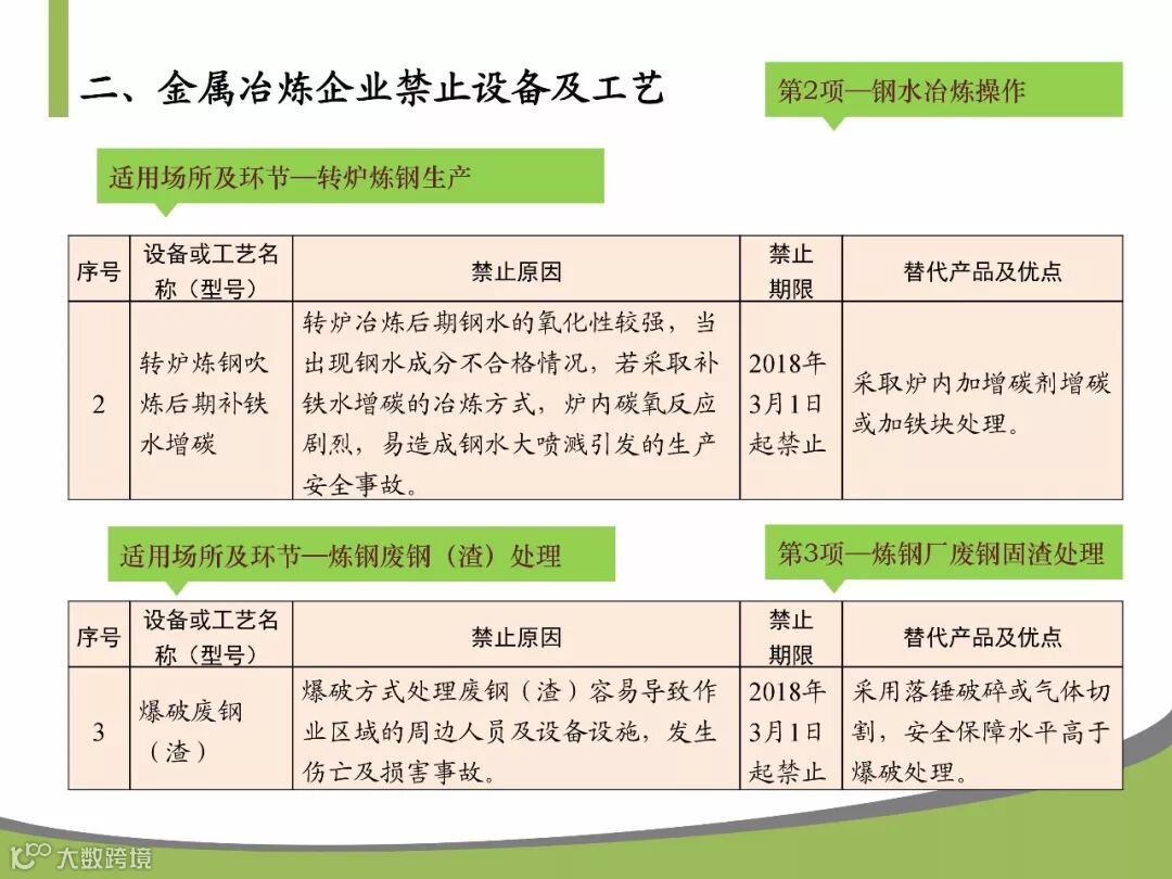 为淘汰严重危及生产安全的工艺和设备,推动金属冶炼企业设备和工艺改善,提高金属冶炼企业安全保障能力,预防生产安全事故,依据《安全生产法》等法律法规,国家安全监管总局制定了《金属冶炼企业禁止使用的设备及工艺目录(第一批)》,早已发布。