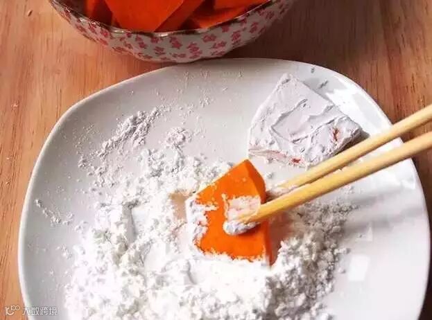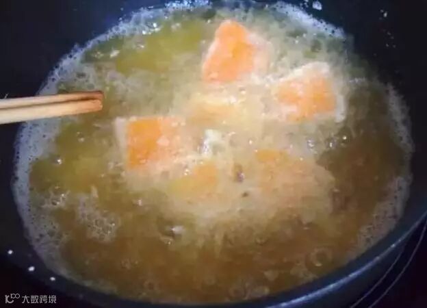 3. 热锅入油,放入南瓜油炸,炸熟后捞起备用。