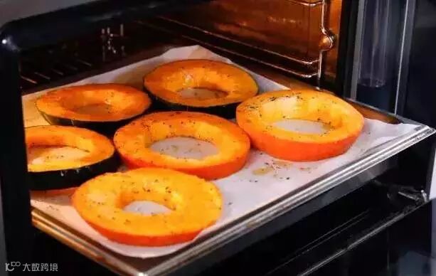 4. 烤箱预热,放入南瓜,烤15分钟。