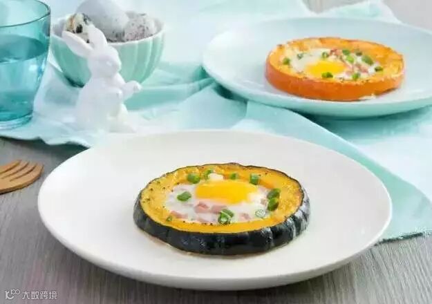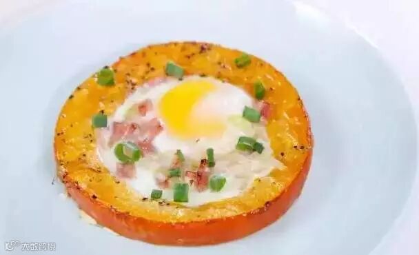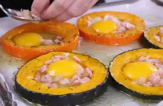 5. 取出烤盘,在南瓜圈上,打入鸡蛋,洒上火腿和洋葱,加盐和胡椒调味。再放入烤箱中烤10分钟。