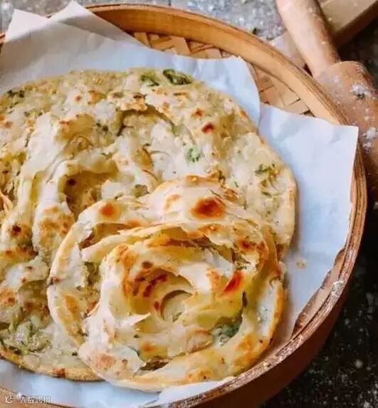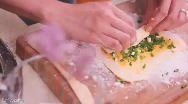 5. 在面饼上加入葱花、芝麻和盐,然后卷起来,再用擀面杖擀开。