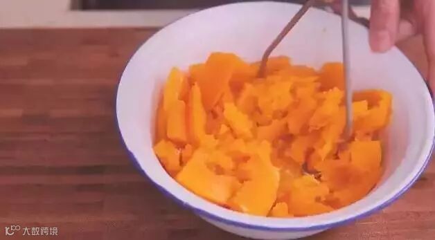2. 南瓜隔水蒸10分钟,然后把南瓜压成泥。