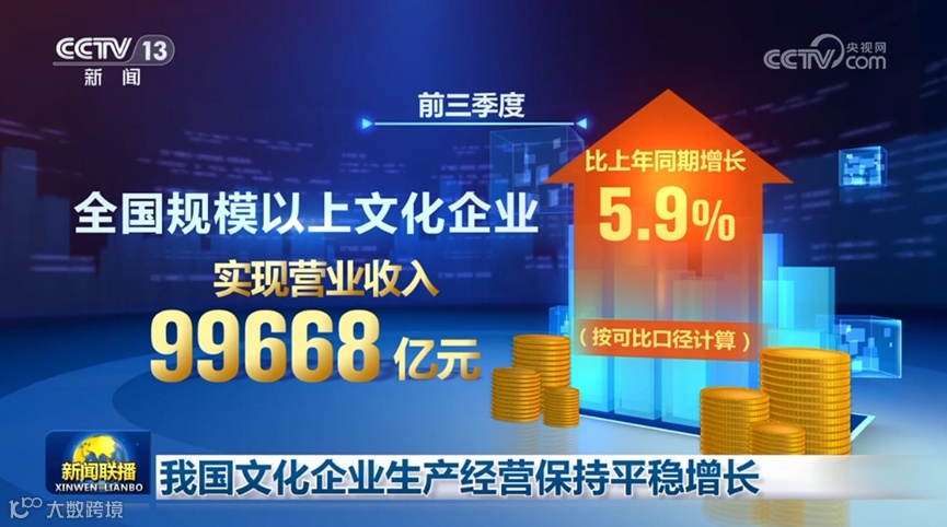 国家统计局10月30日发布数据显示,前三季度,规模以上文化企业实现营业收入99668亿元,按可比口径计算,比上年同期增长5.9%,实现利润总额7903亿元,比上年同期增长3.9%,文化企业生产经营保持平稳增长,文化企业利润总额增长稳定。