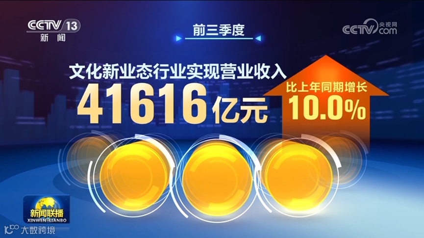 文化新业态行业实现快速增长。前三季度,文化新业态行业实现营业收入41616亿元,比上年同期增长10.0%,对全部规模以上文化企业营业收入增长的贡献率达68.2%,对文化企业增长的贡献率持续增强。