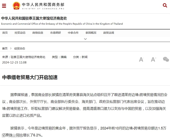 披猜表示,今年是边境贸易的黄金年,据外贸厅报告显示,2024年前10月的边境-跨境贸易总额达1.5万亿泰铢,同比增长了6.2%。