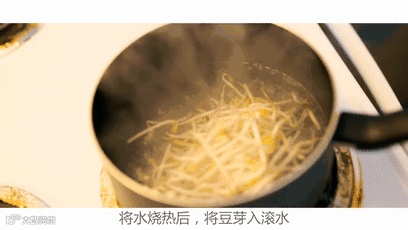 2、锅里加水烧开,放豆芽进去焯30秒钟,捞出来备用。