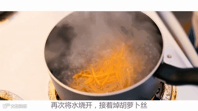 3、锅里加水再次烧开,将胡萝卜丝焯水30秒,盛盘备用。