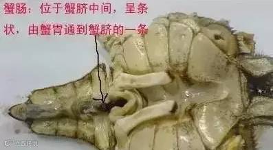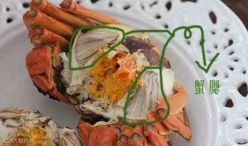 蟹肠:在蟹子腹部的三角形内,掰开后可以看到一条黑线,吃的时候要去除。