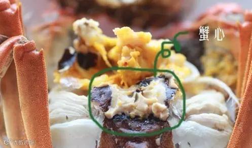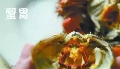 蟹胃:俗称"蟹和尚",在背壳前缘中央,裹在蟹黄中间,似三角形的骨质小黑包,吃蟹黄的时候注意不要吃到蟹胃了。