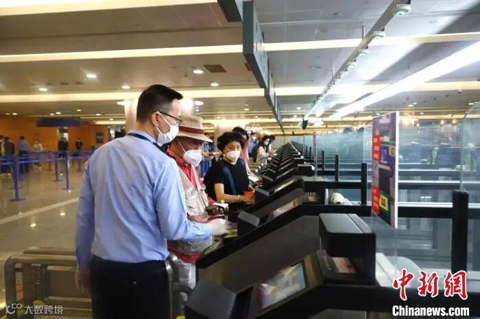 蛇形通道内,旅客在边检工作人员的引导下有序分流候检。 上海边检总站供图