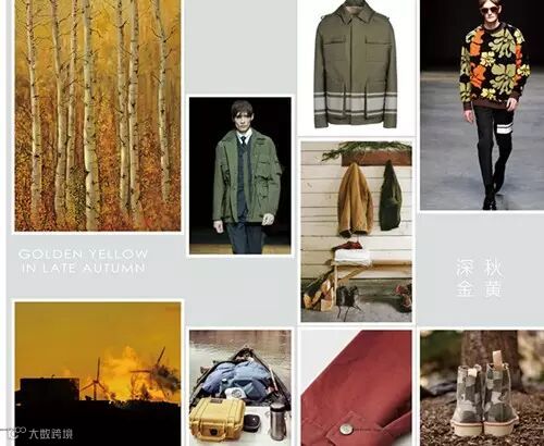 表现户外工装风格,忙碌的节奏变得舒缓。秋季饱和的色彩,引导着生活在都市锅蒸混凝土中的人们走向户外、体会大自然质朴的馈赠。印花图案、亮丽色泽成为人们亲近原始自然的保护色。中黄、金黄的灿烂搭配、叶绿色点缀出自然氛围、浅棕色与可可棕的大地质感、流淌出惬意舒适的生活态度。
