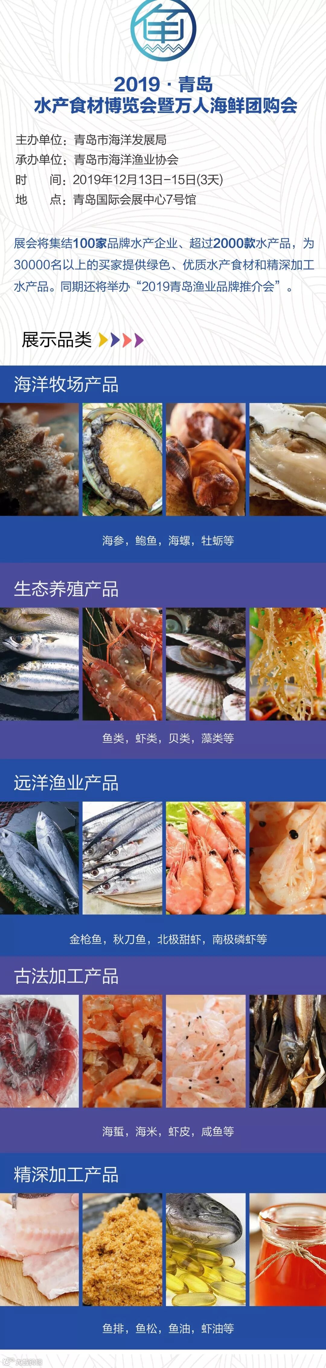 12月13日-15日,2019第二届中国(青岛)品牌农产品展览会暨乡村振兴洽谈会将在青岛国际会展中心1号馆举办,同期在7号馆举办:2019青岛水产食材博览会暨万人海鲜团购会。