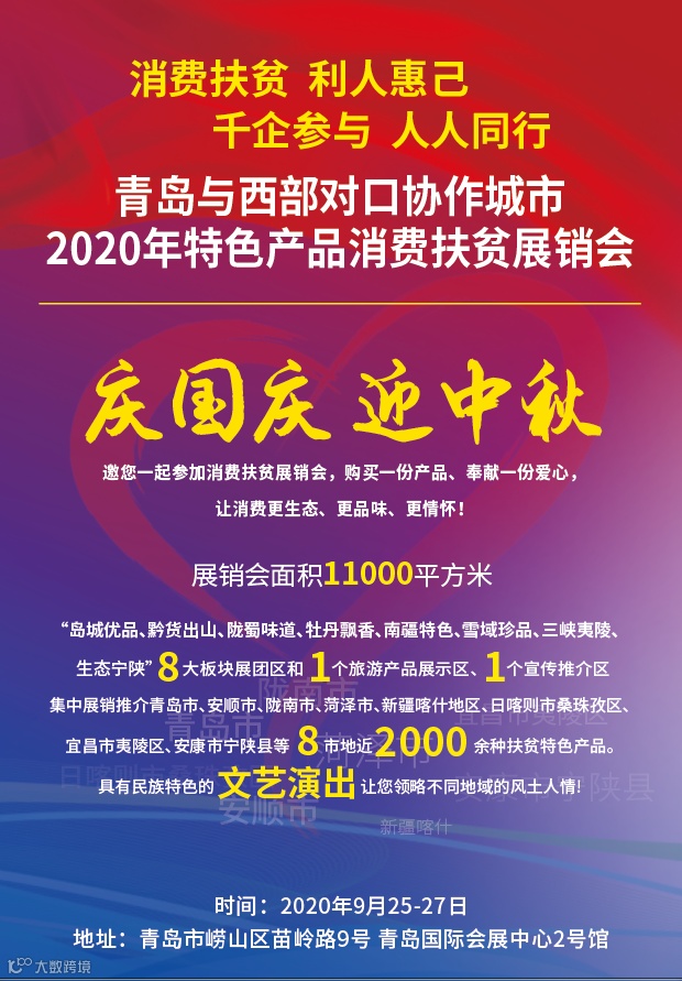 9月份是全国消费扶贫月,青岛市按照国家部署和省要求积极有序推进消费扶贫行动,于9月25日至27日在青岛国际会展中心2号馆举办青岛与西部对口协作城市2020年特色产品消费扶贫展销会。