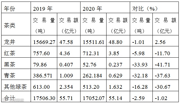 市场累计,1-12月,中国茶市交易总量为17052.07吨,比去年同期17506.30吨下降了2.59%,交易总额55.144亿元,比去年同期55.709亿元下降1.02%。其中:大佛龙井交易量为15511.61吨,比去年15669.27吨下降1.01%,交易额为48.80亿元,比去年47.58亿元上涨2.56%;青茶类交易量为262.18吨,交易额为0.63亿元;红茶类交易量为712.31吨,交易额为3.85亿元;黑茶类交易量为52.76吨,交易额为0.24亿元;其他绿茶类交易量为513.20吨,交易额为1.63亿元;其他茶类交易量和交易额分别为1540.45吨和6.345亿元,同比去年交易量1837.03吨和交易额8.126亿元分别下降10.16%和21.92%。其中2020年度龙井茶年平均交易价为314.60元/公斤,比去年同期303.67元/公斤增长了3.60%。