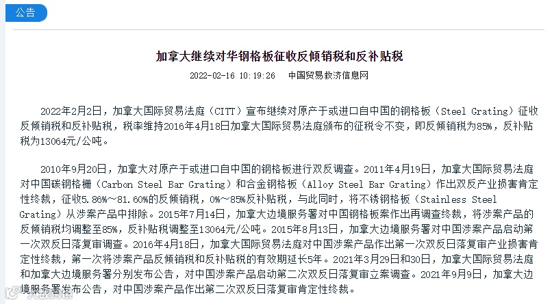 2022年2月2日,加拿大国际贸易法庭(CITT)宣布继续对原产于或进口自中国的钢格板(Steel Grating)征收反倾销税和反补贴税,税率维持2016年4月18日加拿大国际贸易法庭颁布的征税令不变,即反倾销税为85%,反补贴税为13064元/公吨。