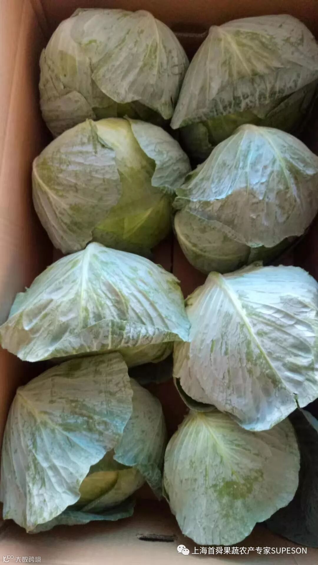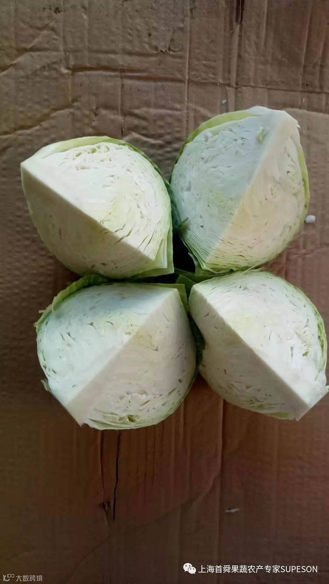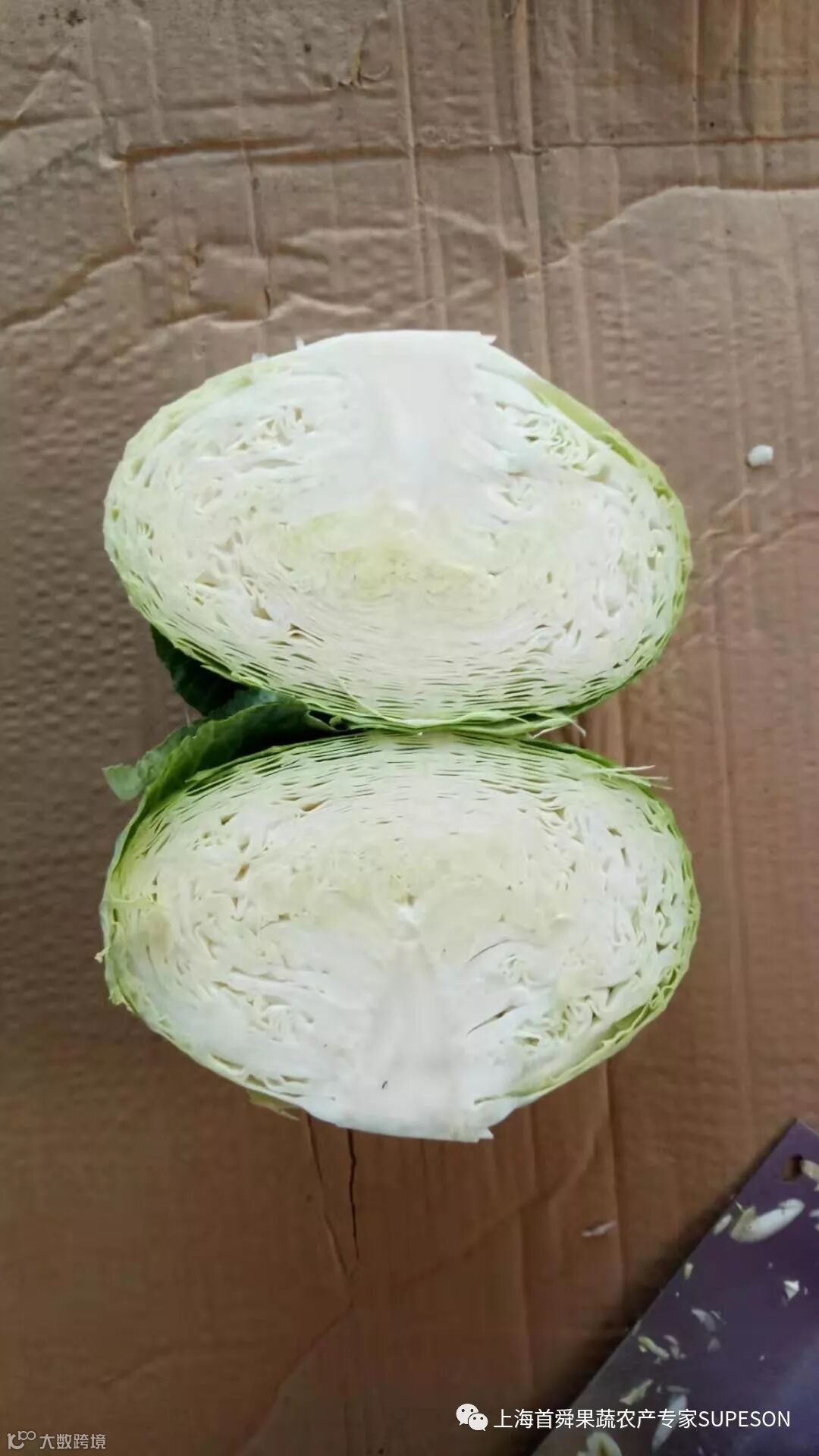 卷心菜品质良好,规格6P-9P,外叶无枯叶,切开中心柱占比1/2以内,无枯边,无裂缝等品质不良情况。