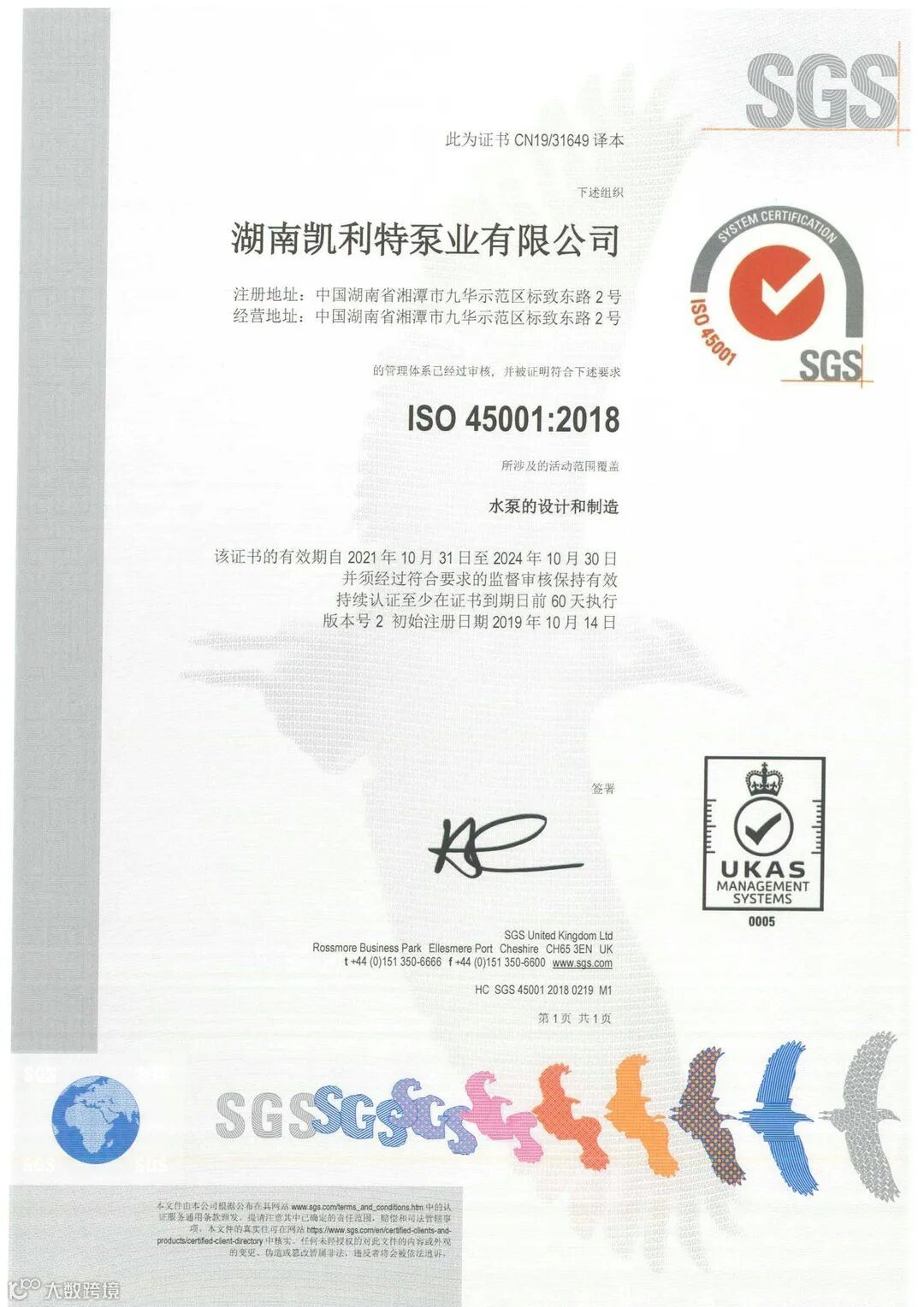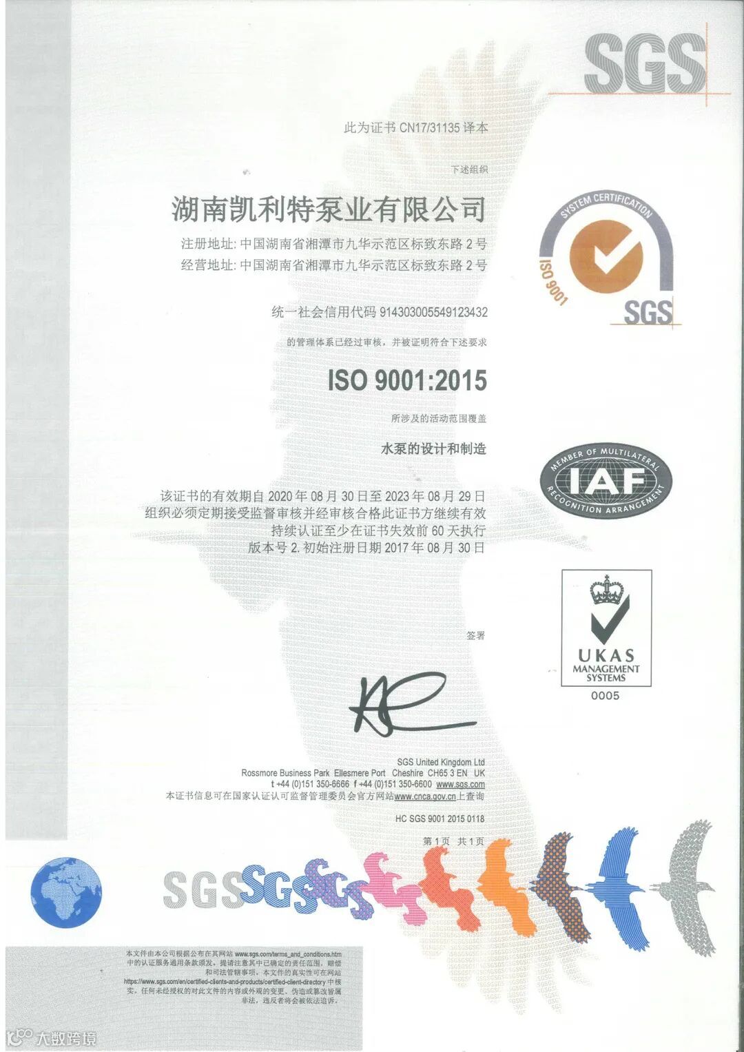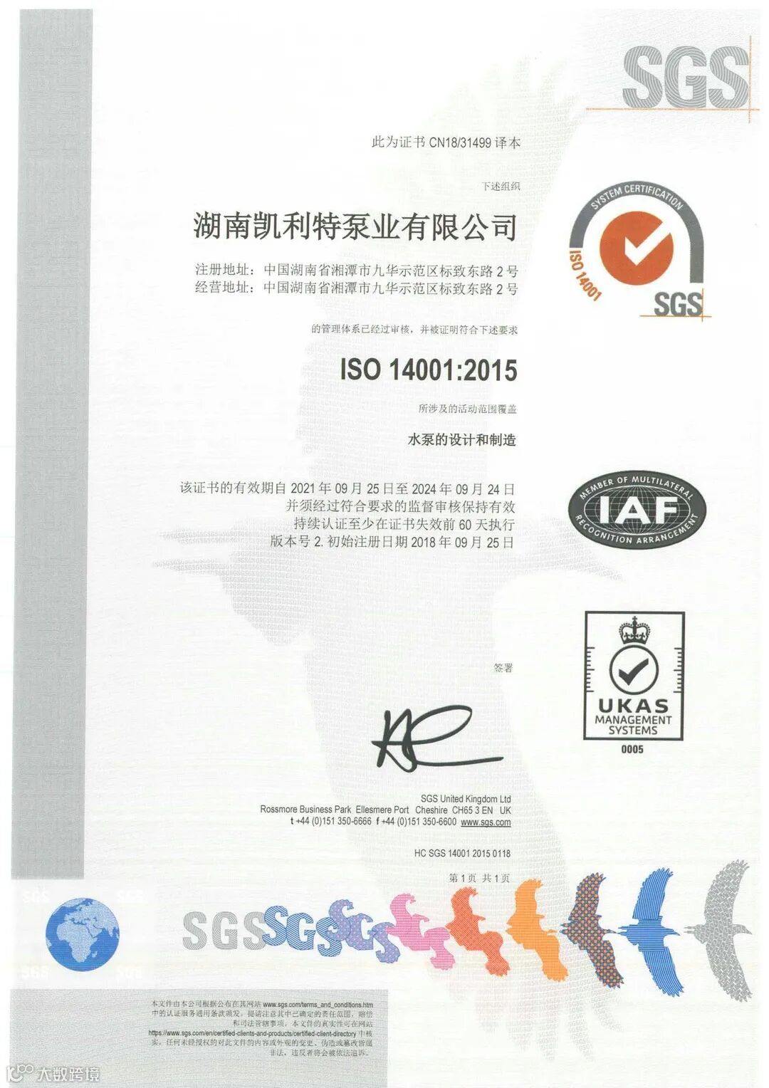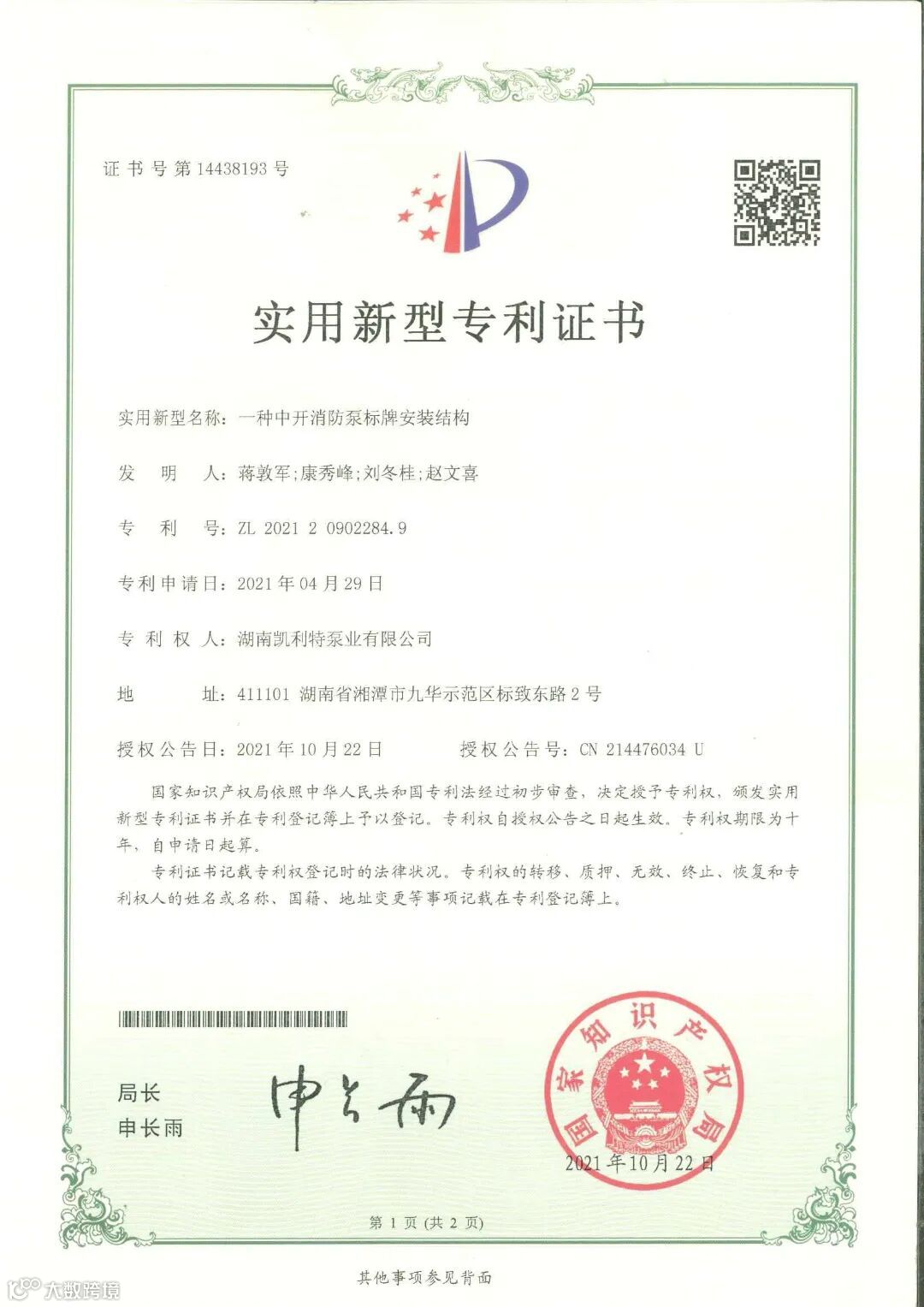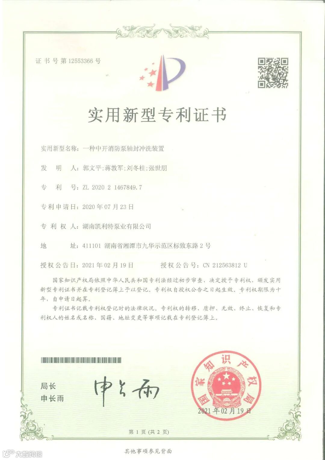湖南凯利特泵业获得FM、UL国际消防认证证书。