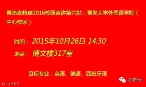 随着企业的不断发展,青岛森特瑞进出口有限公司对优秀人才的需求愈发强烈。从今年10月份开始,森特瑞启动了“森特瑞2016校园宣讲”的2016全国校园招聘巡回宣讲会的活动,分别在青岛和黄岛两地开展个大校招宣讲会。向各所高校准毕业生提供设计类、销售类、广告类、平台操作等多种类别的优质岗位。