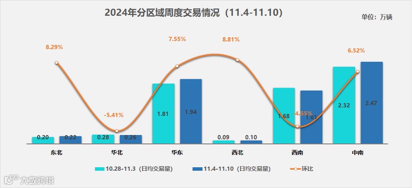 本周全国六大区中,东北地区、华东地区、西北地区和中南地区二手车市场呈现增长态势,其中东北地区和西北地区的增长率相对较高。华北地区和西南地区本周则出现回落,但降幅相对较小。