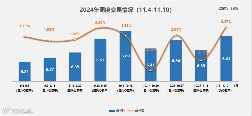 11月伊始,二手车市场延续了震荡向上的发展态势,展现出积极的市场活力。据统计,本周日均交易量达6.61万辆,环比增长3.47%,与十一黄金周的交易规模基本持平,按同口径计算,11月1日至10日的交易量约为54万辆,仅微降0.7%。