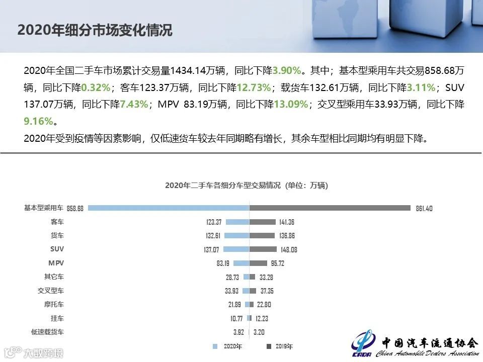 2020年全国二手车市场累计交易量1434.14万辆,同比下降3.90%。其中;基本型乘用车共交易858.68万辆,同比下降0.32%;客车123.37万辆,同比下降12.73%;载货车132.61万辆,同比下降3.11%;SUV137.07万辆,同比下降7.43%;MPV83.19万辆,同比下降13.09%;交叉型乘用车33.93万辆,同比下降9.16%。