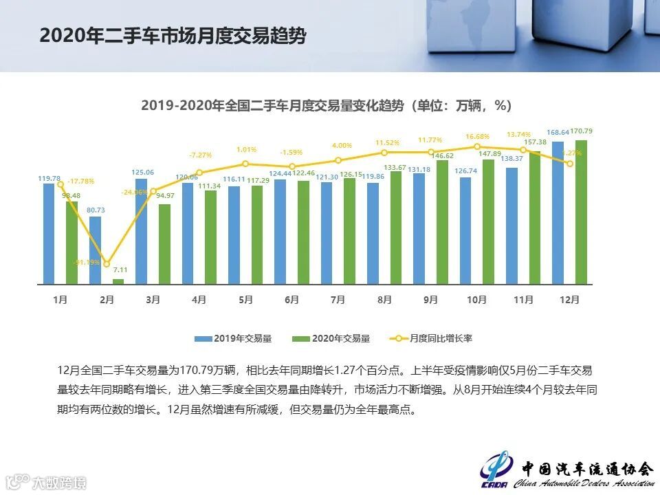 2020年12月,全国二手车市场交易量170.79万辆,交易量环比增长8.52%,月度同比增长1.27%。交易金额为1108.70亿元。
