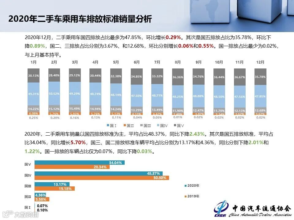 从全年数据来看,2020年二手乘用车销量以国四排放标准为主,平均占比48.37%,同比下降2.43%。其次是国五排放标准,平均占比34.04%,同比增长5.70%,国三、国二排放标准车辆平均占比分别为13.17%和4.36%,同比分别下降2.01%和1.22%。国一排放的车辆占比仅为0.07%,同比下降0.03%。