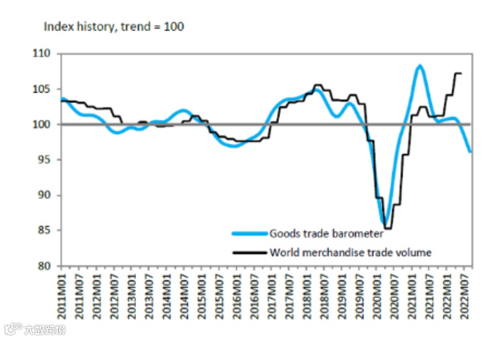 WTO预计,一旦2022年下半年的季度贸易统计数据出炉,商品贸易量指数最终应该会跟随晴雨表指数下降。