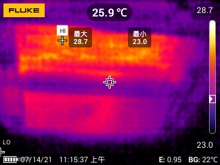 进行完以上碎纸测试后,我们打开该产品内部,通过热成像仪的帮助可以看到,该产品刀片温度稳定的控制在28.7℃(环境温23℃),这也证实了该产品航天级高强度冷轧氮化钢刀的耐用性。
