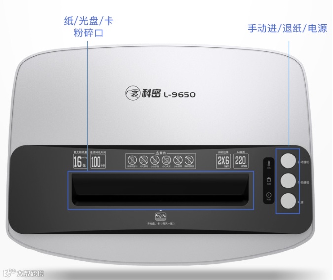 在机身顶部为科密L9650碎纸机进料口和操控区域,我们可以清晰的在进料口前方标注该产品各种性能参数和使用注意事项。值得一提的是,在进料口右侧为该产品的操控区域,白色按键采用了与该区域黑色底色差异化较大的设计,用户可以较为明显的找到对应按键,除了手动进纸、手动退纸、电源按键外,该产品还通过背板底部LED灯为用户提供过热、纸满、电源等状态提示。