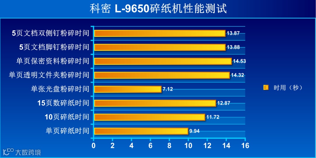 通过上表我们可以看到,得益于420W的大功率电机的加持,科密L9650碎纸机对A4幅面普通复印纸的碎纸时间稳定的控制在10秒左右,当该产品遇到较厚的16页文档,还是难碎的单页透明文件夹,或是有铝箔塑封的单页保密资料,都能维持在14秒左右的成绩。