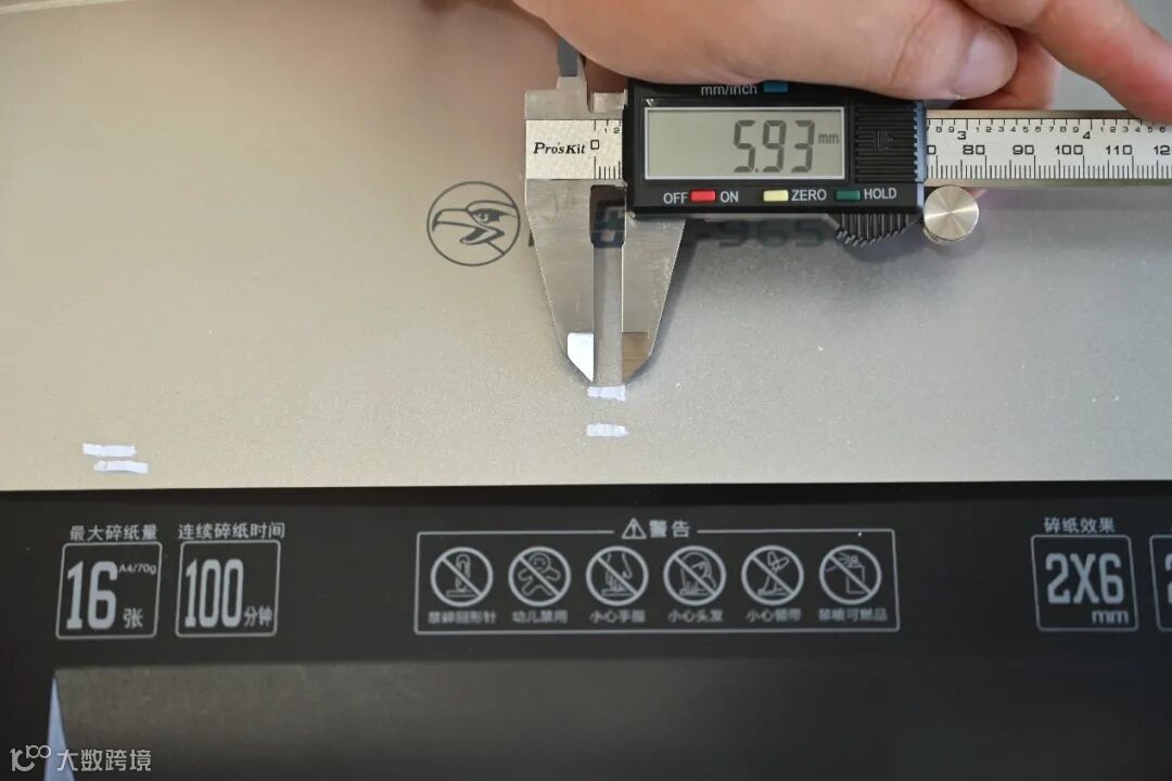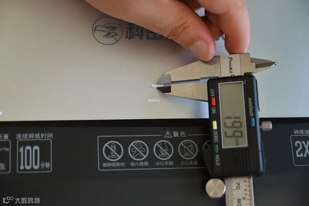 科密L9650碎纸机纸屑呈段状,我们随机抽取该产品一批纸屑,目测挑选其中两张大小相同的纸屑通过游标卡尺测量,经过测量我们可以清晰的看到该产品纸屑大小为5.93mm×1.99mm,比产品标称2mm×6mm还要细小。