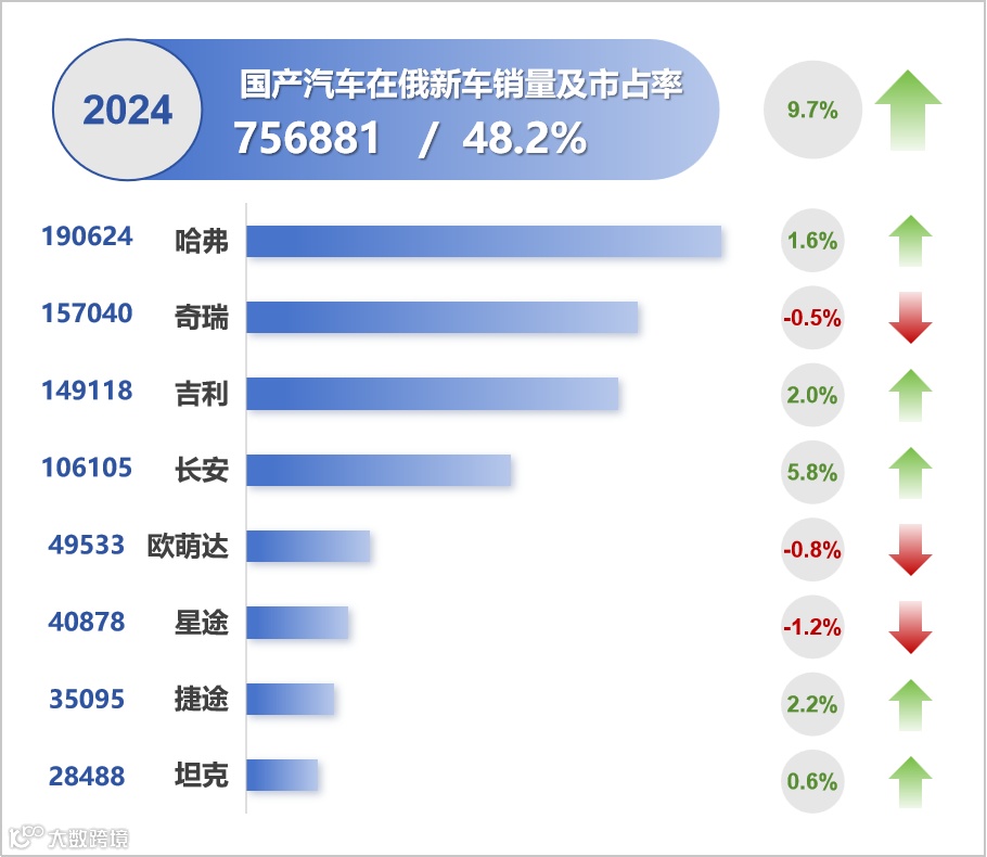 俄乌冲突爆发以来,中国汽车在俄罗斯市场实现跨越式增长。数据显示,2024年俄罗斯汽车销量达157.1万辆,同比增长48.4%,其中中国品牌贡献超六成,哈弗、奇瑞、吉利等品牌跻身销量前十。