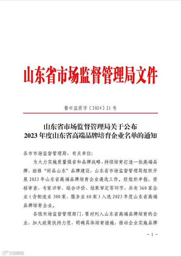 为大力实施质量强省和品牌战略,持续培育打造一批高端品牌,助推“好品山东”品牌建设,山东省市场监督管理局组织开展2023年山东省高端品牌培育企业遴选工作。经组织申报、资格审查、专家评审、综合评价、结果审定等环节,共有360家企业(含制造业300家、服务业60家)入选2023年度山东省高端品牌培育企业。