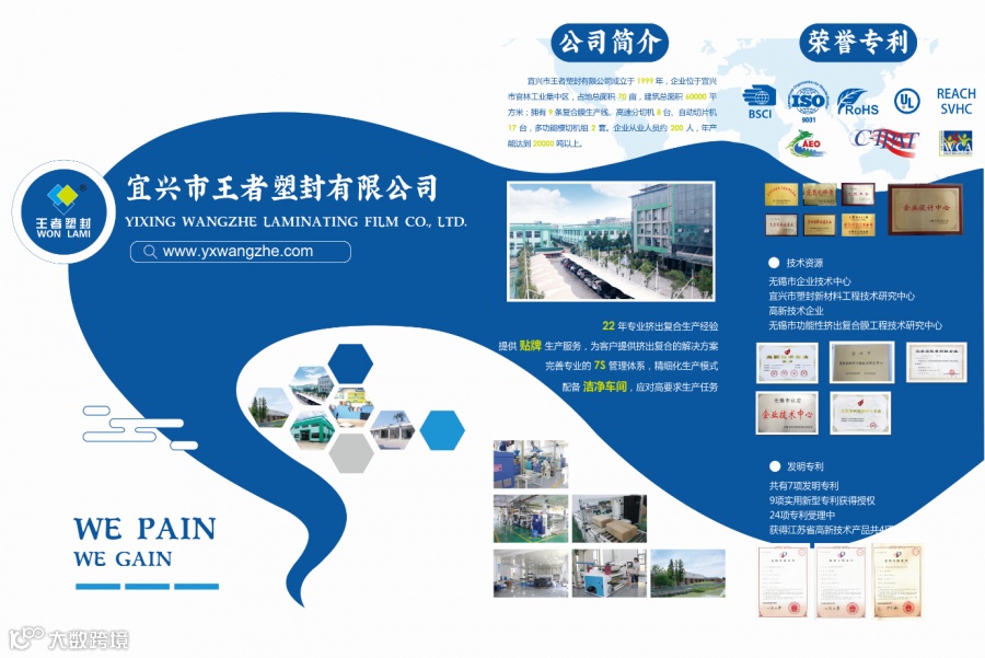 宜兴市王者塑封有限公司成立于1999年,企业位于宜兴市官林镇工业集中区,是一家专业生产功能性挤出复合膜的高新技术企业。公司占地总面积70亩,建筑总面积60000平方米;拥有8条复合膜生产线、高速分切机10台、自动切片机17台,多功能模切机组2套,年产能达到20000吨以上。