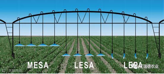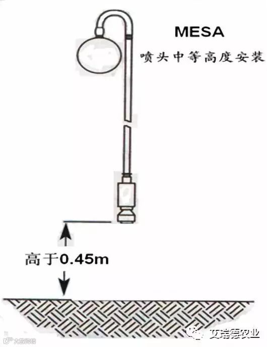 通常大型喷灌机的喷头安装高度(距离地面)都是根据作物进行调节,比如玉米一般是2米安装高度,小麦是1.5米的安装高度,高粱是2.5米的高度,这些都是一般采用中位安装,喷头高度在喷灌机主管与地面高度中间位置左右,用MESA表示(Mid-Elevation Spray application)。