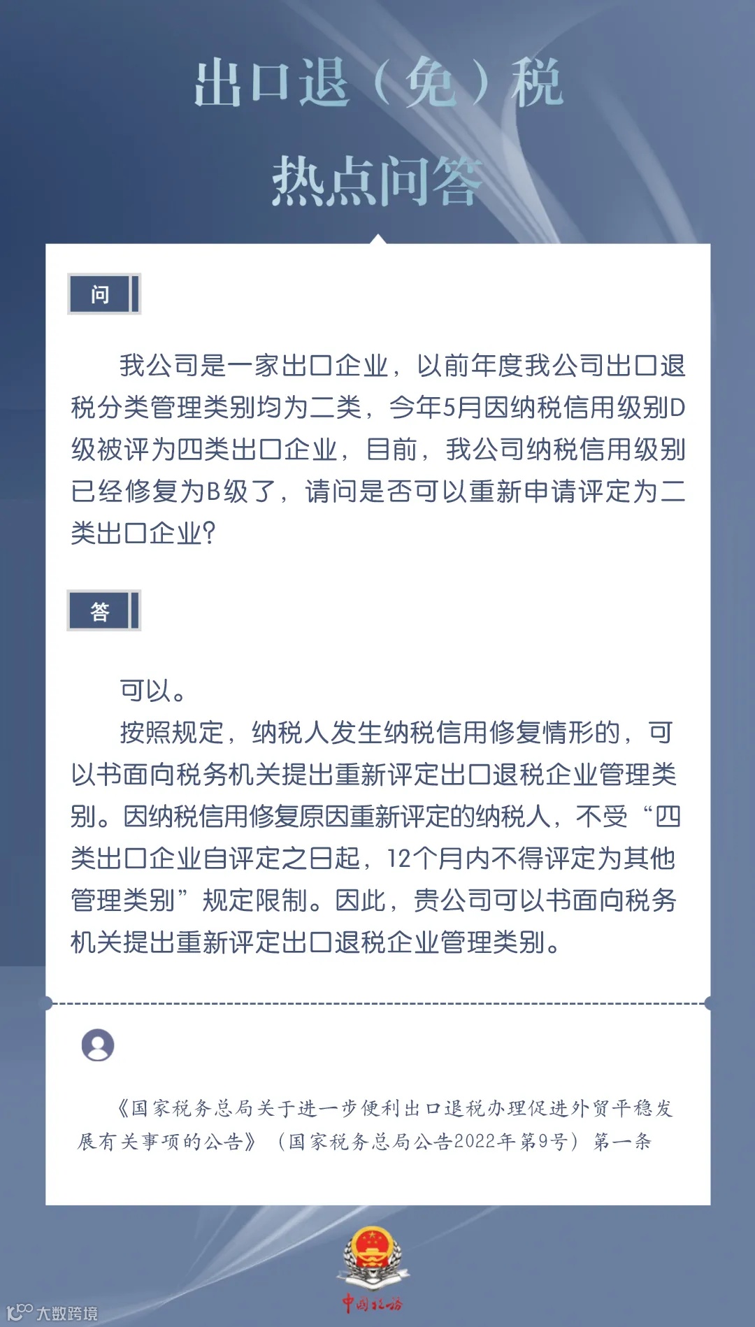 企业纳税信用级别修复后,可否重新申请评定出口退税企业管理类别?