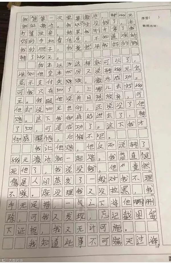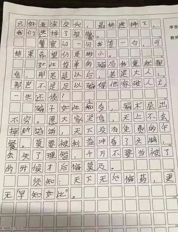 愚人节,也称万愚节,是西方社会民间传统节日,节期在每年4月1日,与古罗马的嬉乐节和印度的欢悦节有相似之处。在愚人节来临前夕,浙江温州一小学生写的受骗作文刷爆网络,她将自己前段时间遭遇的骗局和受骗经过详细地写进了作文,用稚嫩的言语提醒广大网友谨防被骗。