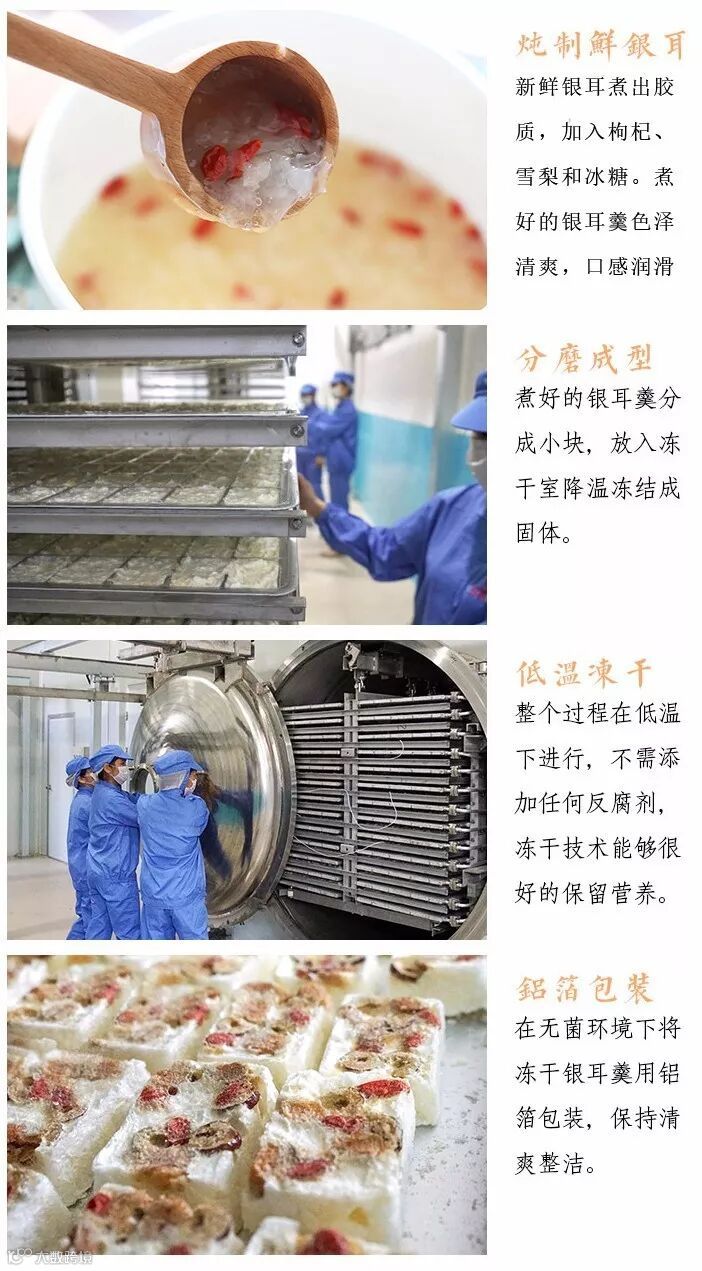 立兴食品甄选了4种地道的食材,将古田银耳、宁夏枸杞,广西冰糖和赵县雪梨,小火细熬慢炖3小时后,通过真空冷冻干燥技术(简称FD),最大限度地保存了雪梨银耳汤的色、香、味、形和营养成分,且食用方便、营养、健康、时尚。