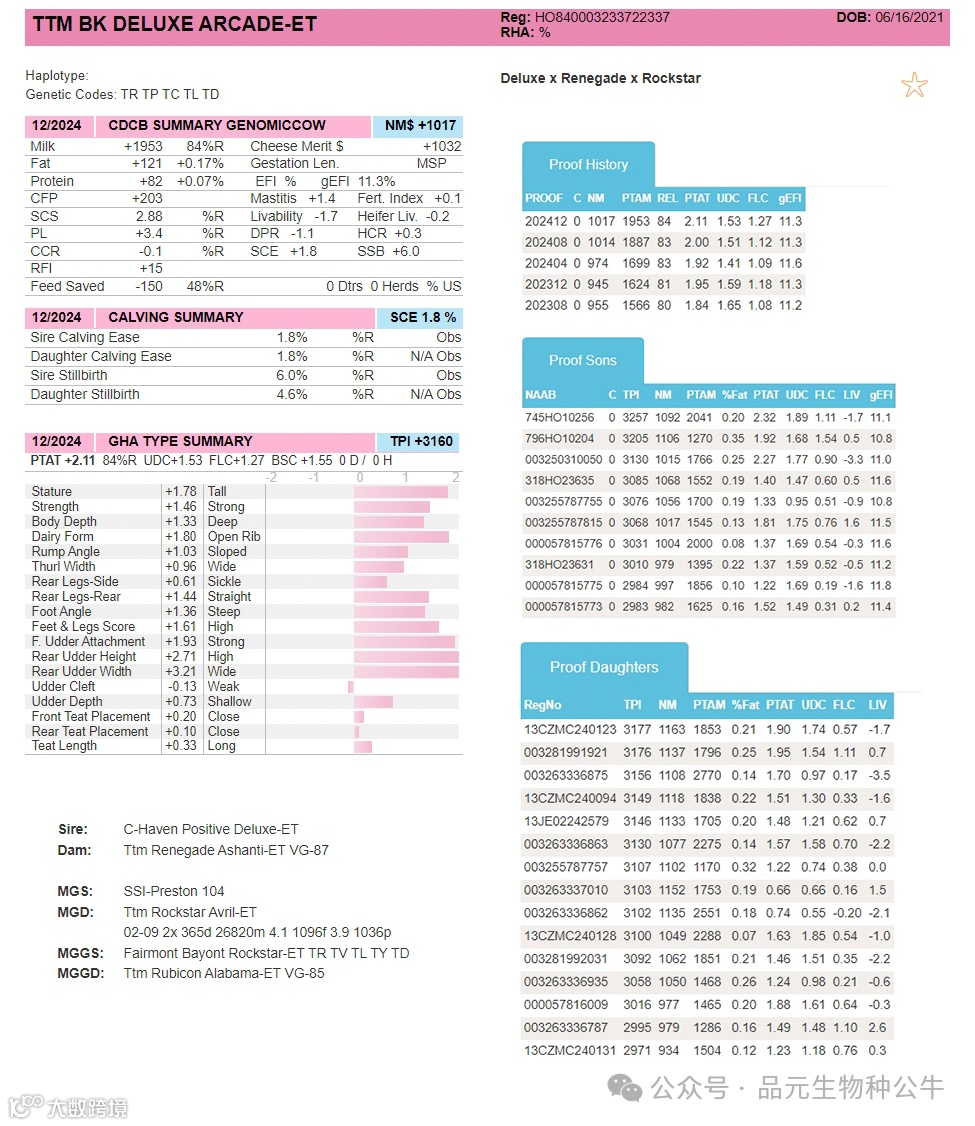 TTM BK DELUXE ARCADE-ET是ANDES的母亲,来自美国马里兰州的Mercuro Farm,是一头出类拔萃的母牛,拥有Deluxe x Renegade x Rockstar的优势家系组合,师出有名,后代综合性能突出(GTPI+3160),体态完美(PTAT +2.11,UDC+1.53),肢蹄强健(FLC+1.27)、盈利突出(NM$+1017),优质高产(CFP+203,PTAM+1953),乳头位置匀称,长度合适,非常适合机器人挤奶,因此成为Mercuro Farm最受欢迎的供体母牛之一。