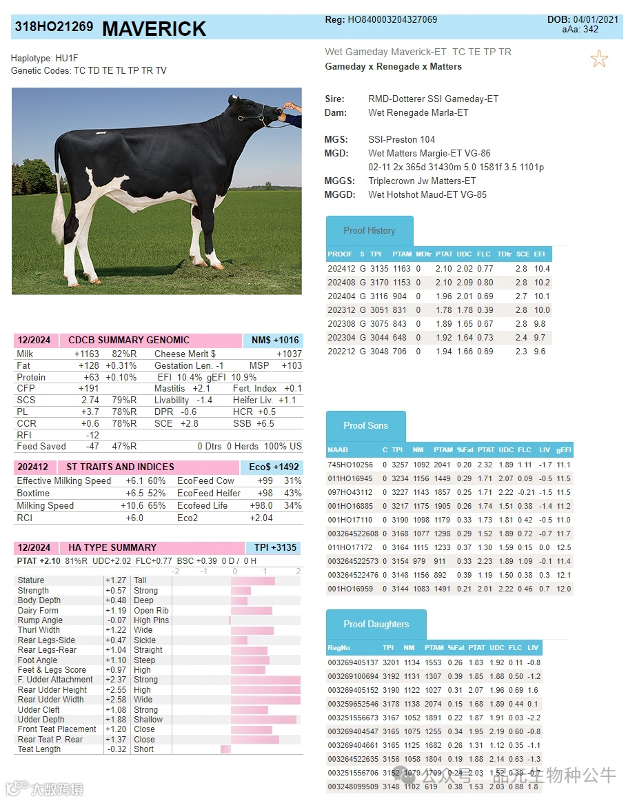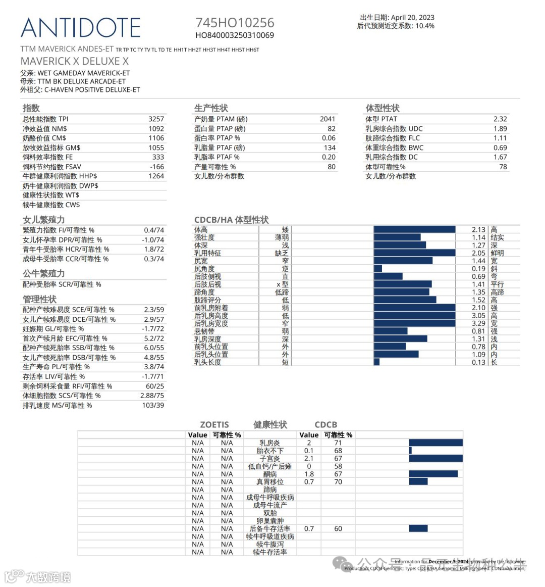 ANDES分别于2024年4月、8月和12月位列基因组种公牛全球第66、113和146名。GTPI均稳定在+3250以上,净价值维持在$1100左右,产奶量育种值+2041Lbs,并呈持续上升趋势;后代乳香浓郁(CFP+216Lbs),健康盈利能力强且饲料效率高(HHP$+1264,FE+333),拥有近乎完美的体型和强健的肢蹄,是一头高产、高质、高效、健康的精英公牛。