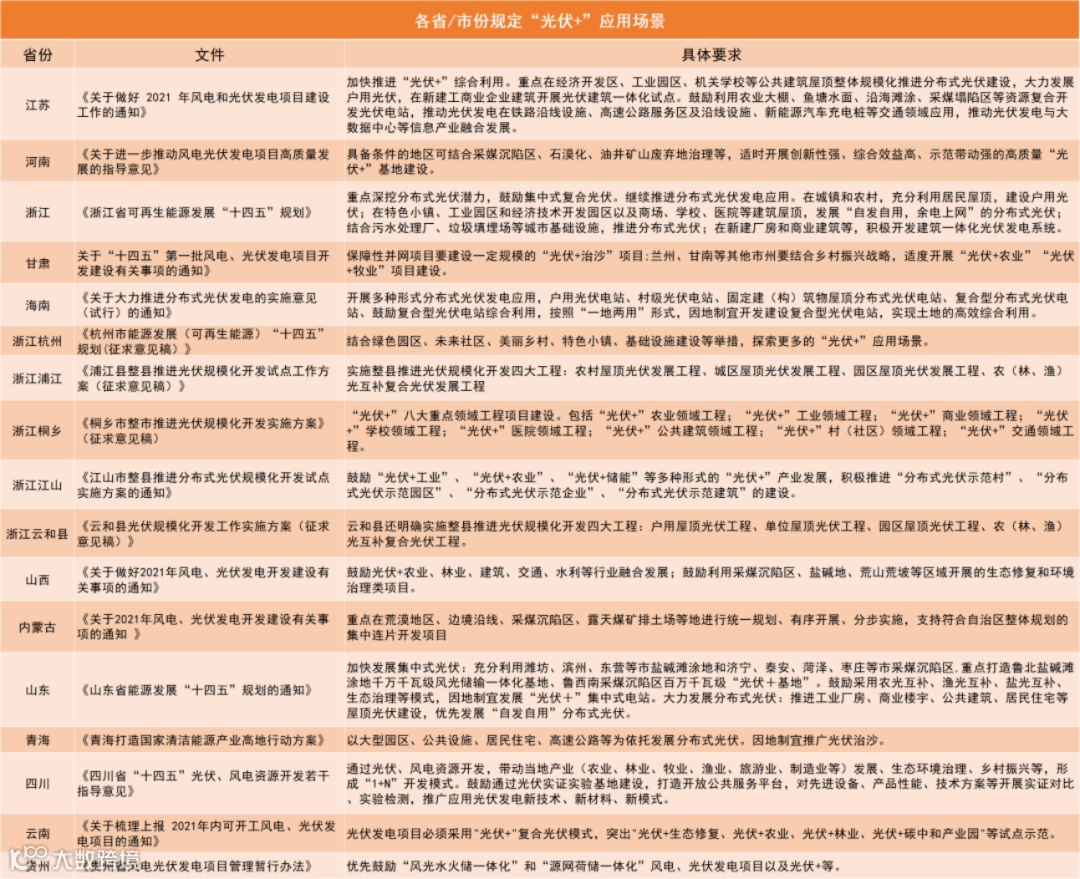 全国超过15个省市地区在光伏管理政策中提出了“光伏+”相关的标准与要求,各省市提出鼓励光伏电站与产业园区、学校、农业大棚、鱼塘水面、废弃矿区等场景相结合,不断探索更多的“光伏+”应用场景。