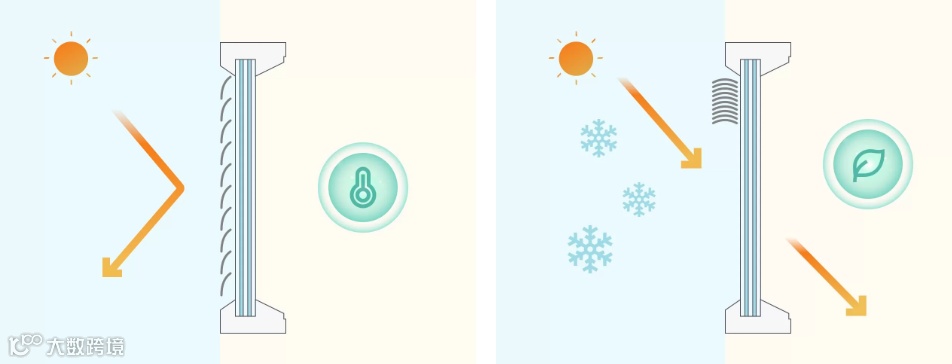 夏天(左)冬天(右)卷帘不同状态下太阳辐射示意图