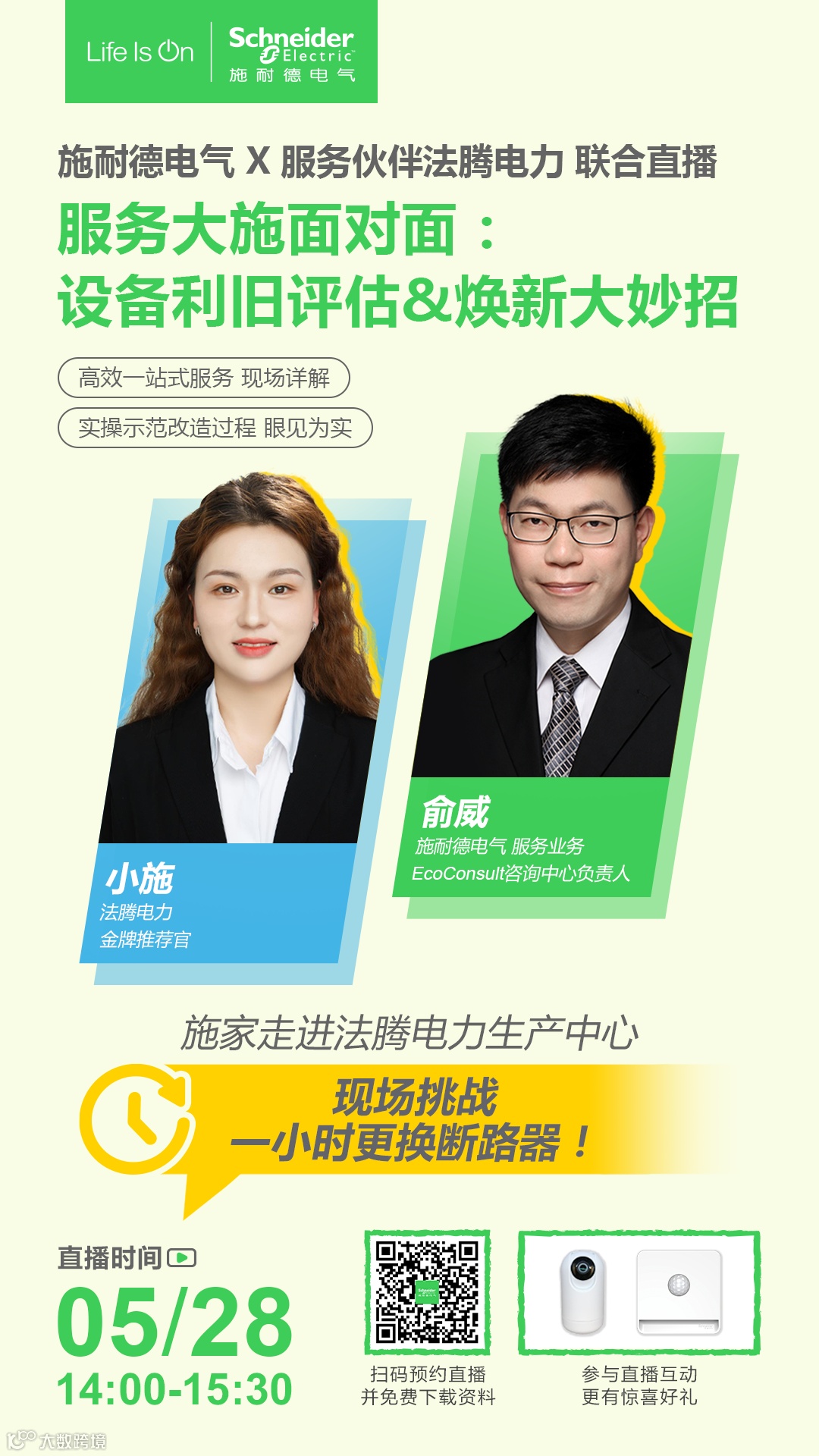 想要直击施家改造服务实操现场,听施家咨询顾问对话行业伙伴、技术专家,进一步了解施家EcoFit™适配改造服务与设备利旧评估一站式服务的独家优势?5月28日14:00-15:30,来施耐德电气直播间一探究竟!