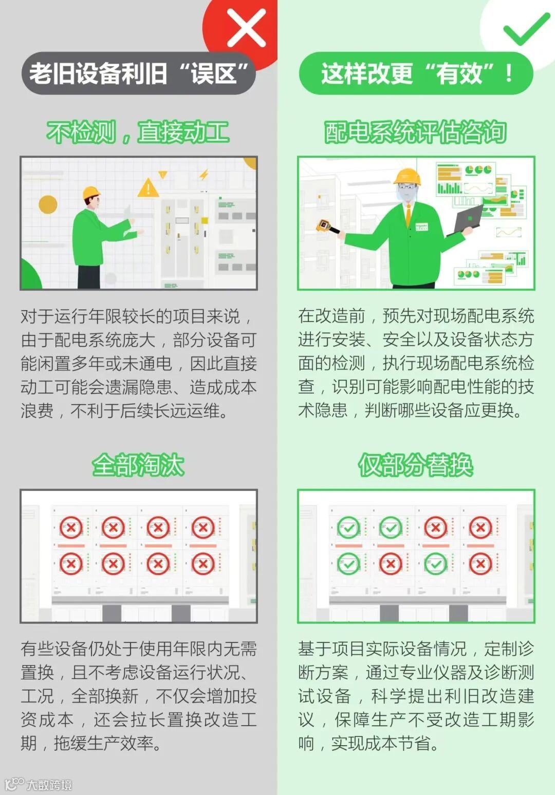 自“大规模设备更新”相关政策出台后,实现设备充分利旧、降低改造成本,已成为各行各业的普遍需求。在此背景下,今年施家还将MPS配电系统咨询服务(简称MPS)、设备诊断测试服务以及适配改造服务“合三为一”,融合推出了设备利旧评估一站式服务,以更全面、专业的服务模式,助力设备更新,一键焕新!