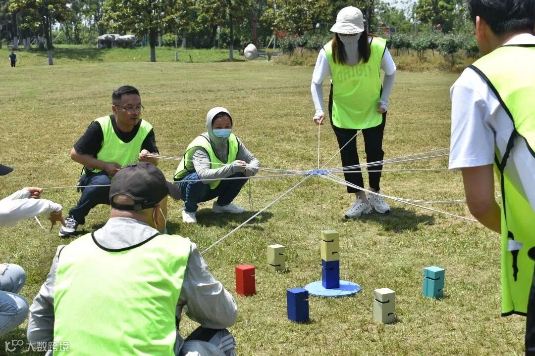 该项目要求各组队员用一只拴着许多绳子的挂钩去操作,每人拉着1-2根绳子末端,使得挂钩成功操作立方块互相重叠增高,同样要求下最快完成搭建的团队为冠军。在排练了几分钟后,各队投入了正式的比拼,大家互相鼓励,及时沟通,尽量保持力道上的平衡,最终五队以最短的时间完成了7块方块的堆叠。