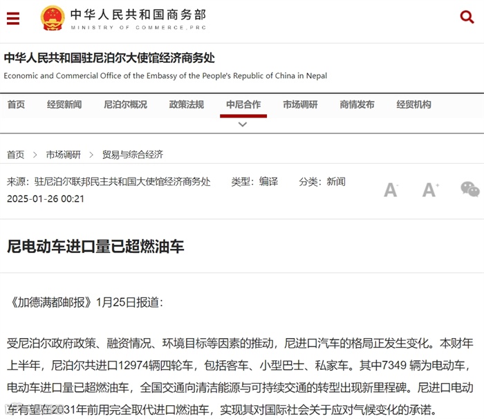受尼泊尔政府政策、融资情况、环境目标等因素的推动,尼进口汽车的格局正发生变化。本财年上半年,尼泊尔共进口12974辆四轮车,包括客车、小型巴士、私家车。其中7349 辆为电动车,电动车进口量已超燃油车,全国交通向清洁能源与可持续交通的转型出现新里程碑。尼进口电动车有望在2031年前用完全取代进口燃油车,实现其对国际社会关于应对气候变化的承诺。