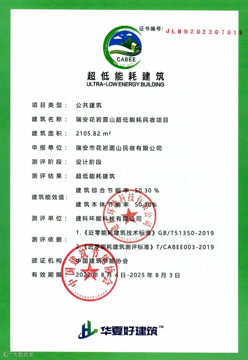 同时取得“超低能耗建筑”认证的还有金星宇遮阳同步建设的瑞安花岩圆山超低能耗民宿项目。