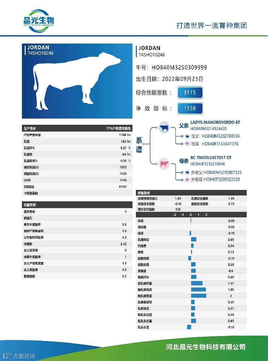 河北品元生物科技有限公司成立于1977年,于2022年成功入选国家种业阵型企业,先后加入美国荷斯坦奶牛协会、国际育种联盟(NAAB)、北方联盟及河北省荷斯坦奶牛种质创新联盟等组织。主要从事奶(肉)牛育种、冻精和胚胎的生产及销售、育种技术服务和进出口业务。品元生物坚持国内国外同步自主育种,充分利用国际资源,加强民族自主育种,致力于培育出国内领先、国际先进的种公牛,打造世界一流育种集团。